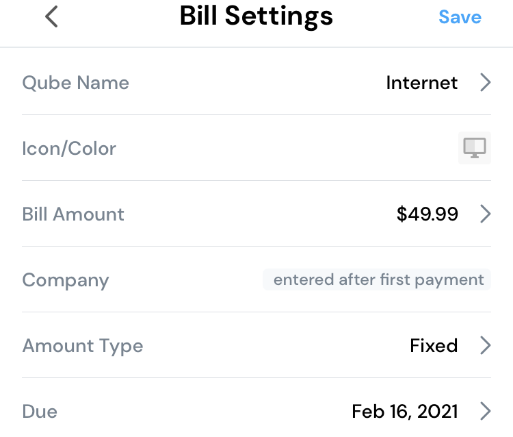 For any recurring debit card payments such as Netflix or Spotify you can set up a Bill Qube for each merchant. You can also set up a Bill Qube for variable payments such as utilities.