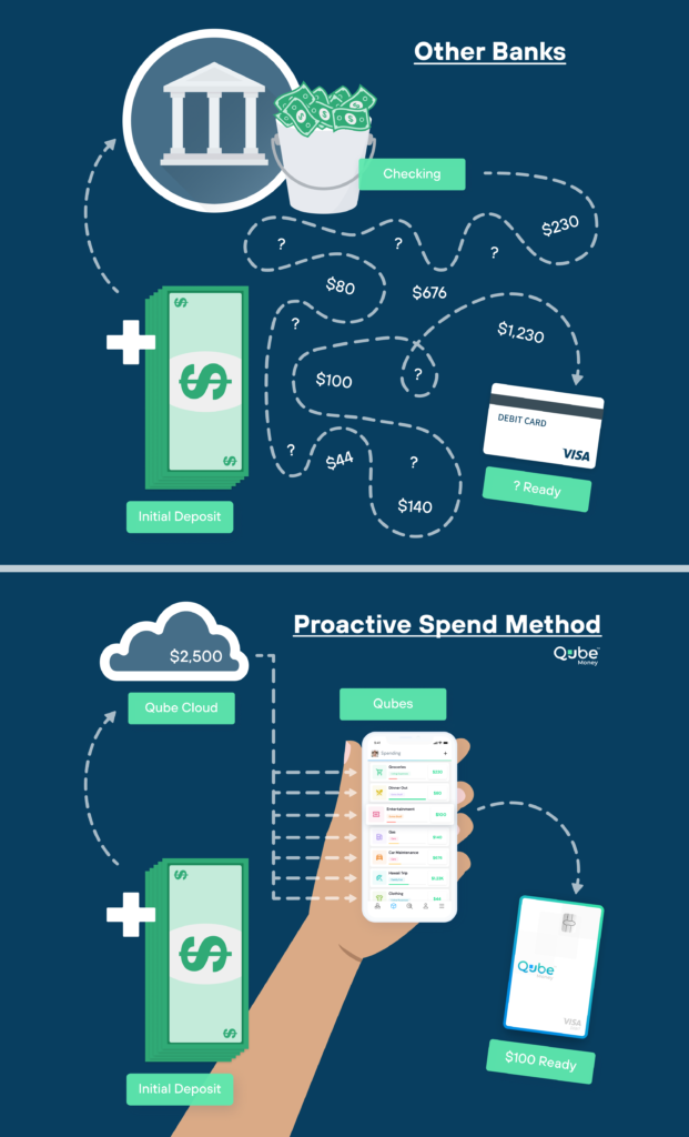 The Proactive Spend Method is our patented system of spending that helps you spend intentionally and with purpose. It involves proactively managing your money and placing it in qubes (budgeting categories) BEFORE you spend. You’re required to actively manage your money before you can spend.